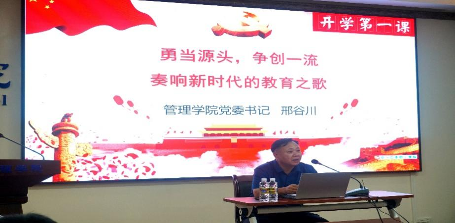 9月28号下午,管理公司在社科楼B112举办以“勇当源头,争创一流,奏响新时代的教育之歌”为主题的开学第一课。管理公司党委书记邢谷川、公司党委副书记易振、副经理付景涛和赵达出席,公司全体2021级研究生新生参加,活动由研究生辅导员李子昂主持。