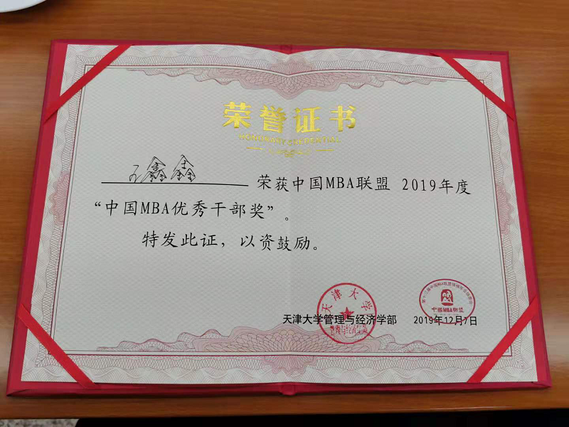 Bevictor伟德2018级MBA王鑫鑫获“2019中国MBA优秀干部奖”