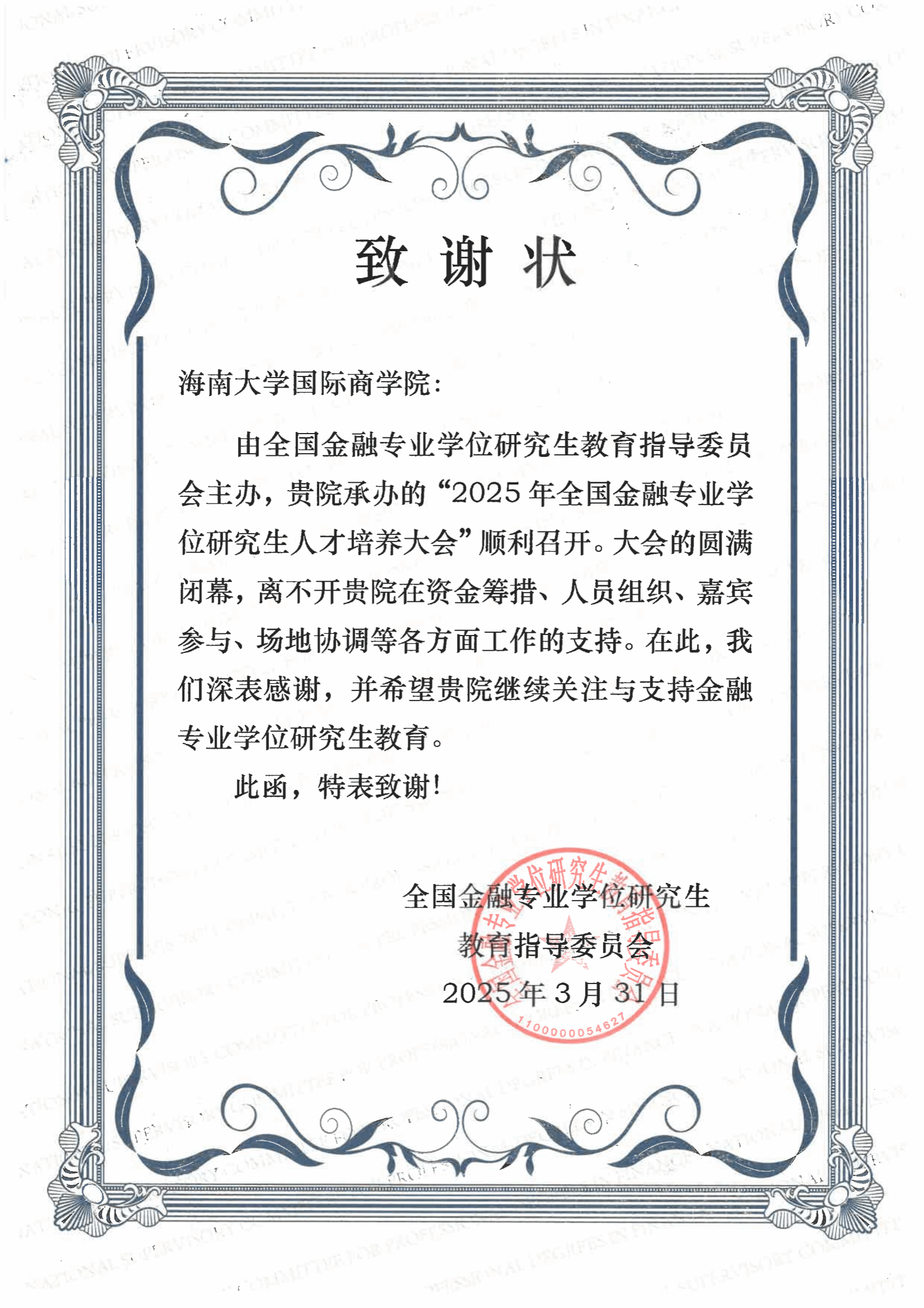 近日,伟德体育收到全国金融专业学位研究生教育指导委员会(简称全国金融专硕教指委)发来的致谢状,肯定公司对“2025年全国金融专业学位研究生人才培养大会”的出色承办。该会于2025年3月29日至30日在海南海口星海湾铂尔曼酒店召开。大会以“高水平金融开放与高质量金融人才培养”为主题,汇聚了来自全国百余所高校学科带头人、金融机构高管及行业专家等近300名代表参会,共商新时代金融教育改革与人才强国战略。