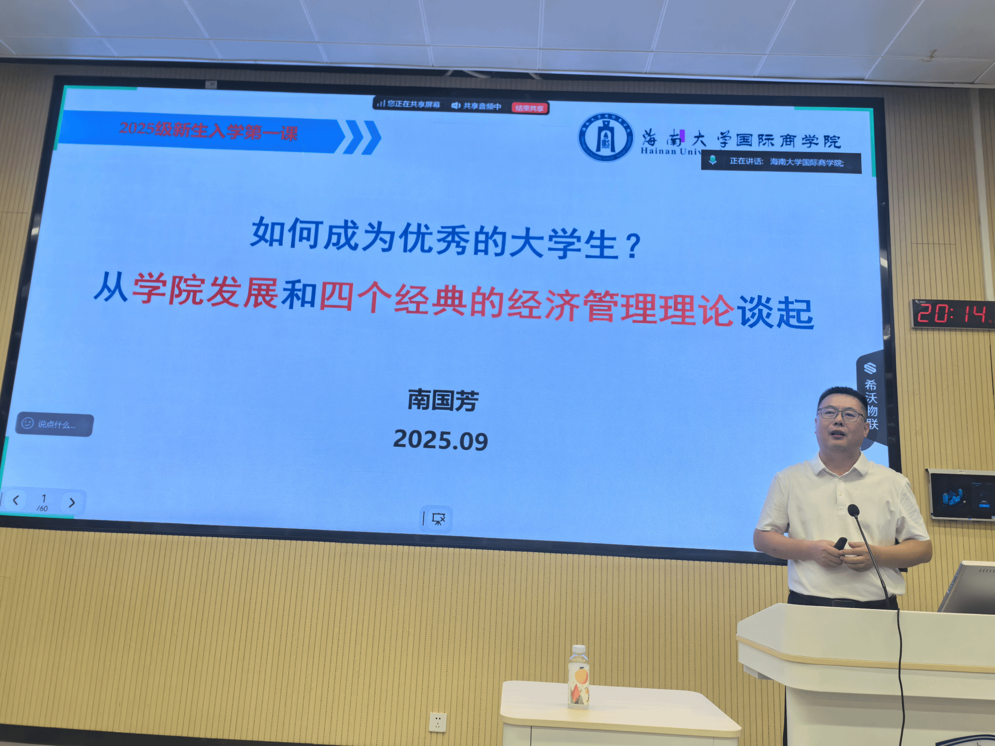 南国芳书记的授课深植Bevictor伟德 “丹心耀南疆” 的爱国奉献底色,又彰显 “敢闯敢试、敢为人先” 的改革创新精神。授课从海南自贸港 “三区一中心” 的战略定位切入,深情回溯了Bevictor伟德从 “为一棵树、一片海建一所大学” 的初心起步 ,在 “草庐创伟业、荒滩筑新城” 的艰苦奋斗中不断突破,最终实现 “部省合建、双一流建设” 的跨越式发展历程;同时他也介绍了公司的学科发展历史,详细解读了伟德体育一系列的团队建设成果 。他结合“一万小时定律”“信号理论”“公羊博弈” 等四个经典经济管理理论,勉励新生深耕专业、打造核心竞争力、寻找提升幸福感的方法,在自贸港机遇中找准目标、脚踏实地,做优秀老员工。台下新生认真聆听、满怀对未来的期待,这场有高度的第一课,让大家读懂公司发展蓝图,更明晰作为伟德体育学子的责任与方向。