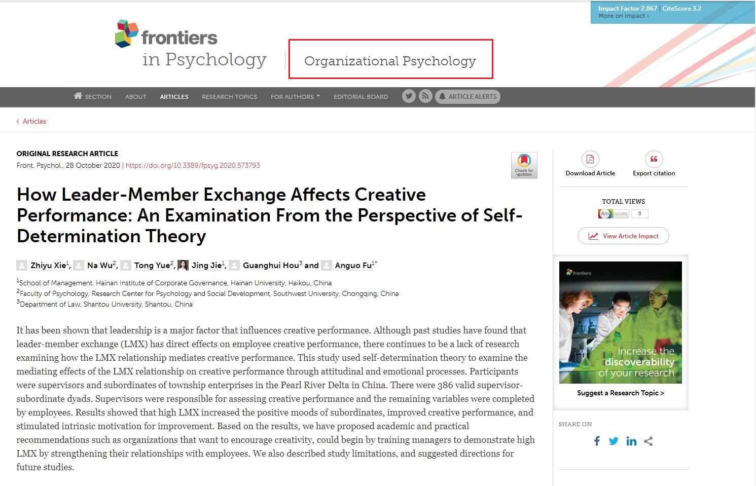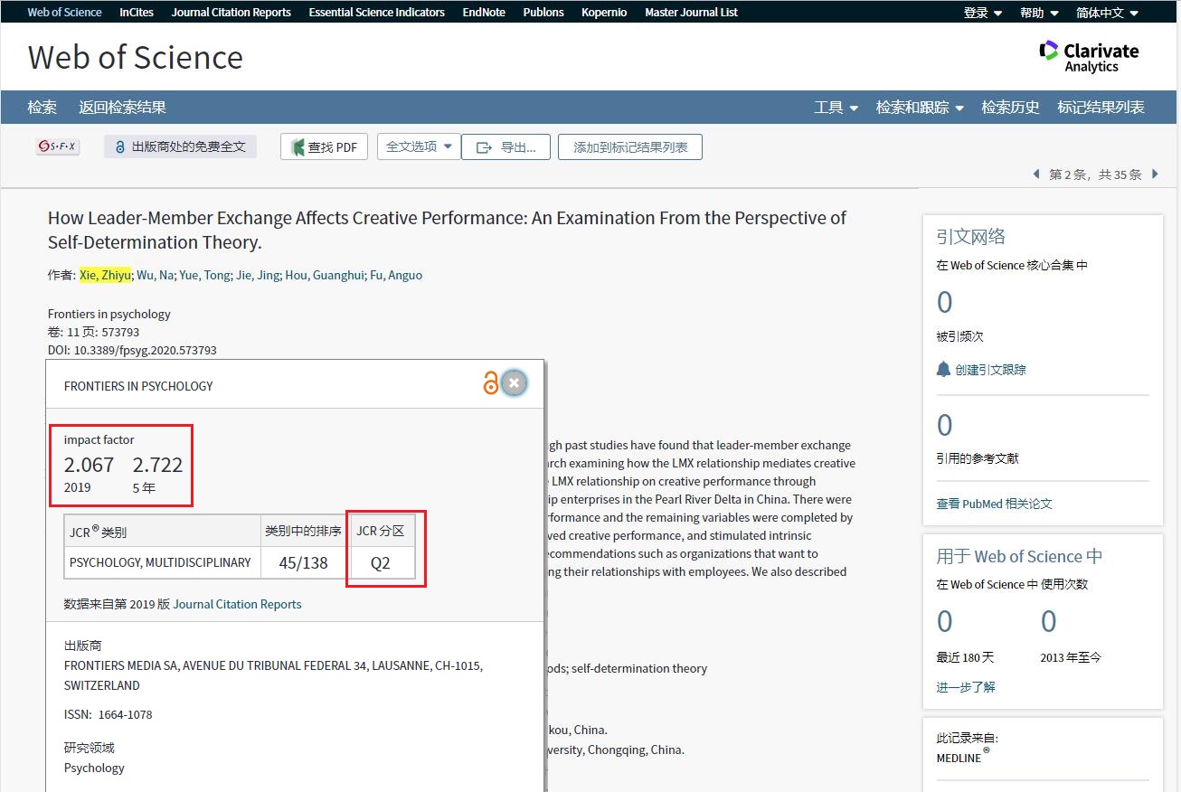 近日,管理公司硕士研究生解智宇以第一作者在国际学术期刊Frontiers in psychology: Organizational PsychologySSCI二区,IF=2.067)上发表了题为“How Leader-Member Exchange Affects Creative Performance: An Examination From the Perspective of Self-Determination Theory”的研究论文(doi: 10.3389/fpsyg.2020.573793) ,这是公司硕士研究生首次以第一作者在国际期刊上发表组织心理与人力资源管理方面的研究论文