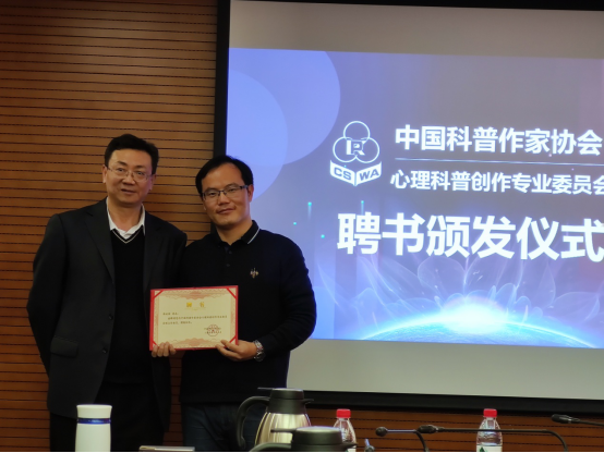 2020年12月18日,在北京中国科技会堂举办的中国科普作家协会第八次全国代表大会暨2020年年会上,管理公司教师傅安国被聘为新成立的心理学科普创作专业委员会副主任委员。中国科普作家协会理事长、国际著名古生物学家周忠和院士为其颁发聘书。