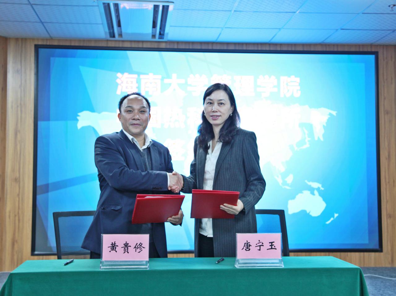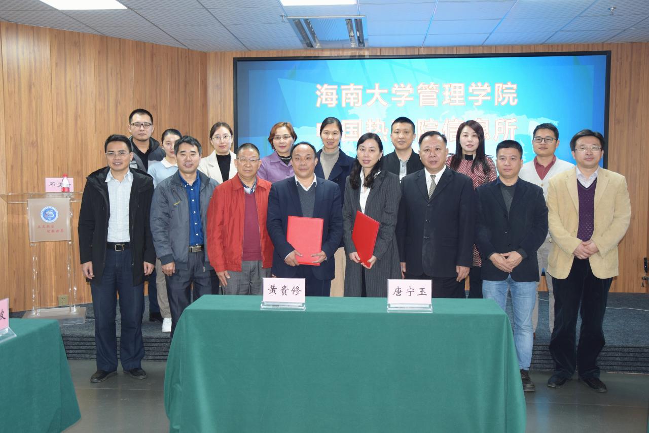 之后,双方就员工培养、平台建设、热带农业发展、未来规划等方面内容展开了亲切交流与深入讨论。唐宁玉经理与黄贵修所长正式签署合作框架协议,在今后,双方将本着“优势互补、双方互动、合作共赢、共谋发展”的原则,充分发挥彼此优势,通过整合各方资源,采取联合培养研究生、平台(基地)共享共建、共同组建科研团队,联合申报科研项目,组织开展学术交流等措施加快提升科学研究水平和人才培养质量,协同推进热带农林经济管理学科发展,为热带农业发展和海南自贸港建设提供强有力的科技和人才支撑。