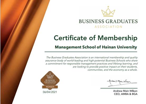 成为BGA正式会员是公司推进商公司国际认证的重要一步,有利于推动公司高质量持续发展,加强一流团队建设,促进国际交流和合作研究,提升国际化水平和影响力。公司将充分利用国际组织和会员网络提供的平台、资源和优势,紧跟国际商科教育发展前沿领域,进一步对标商科国际人才培养质量和标准,加快提升专业化、国际化水平,争创一流商公司,为海南自贸港建设贡献管理智慧。