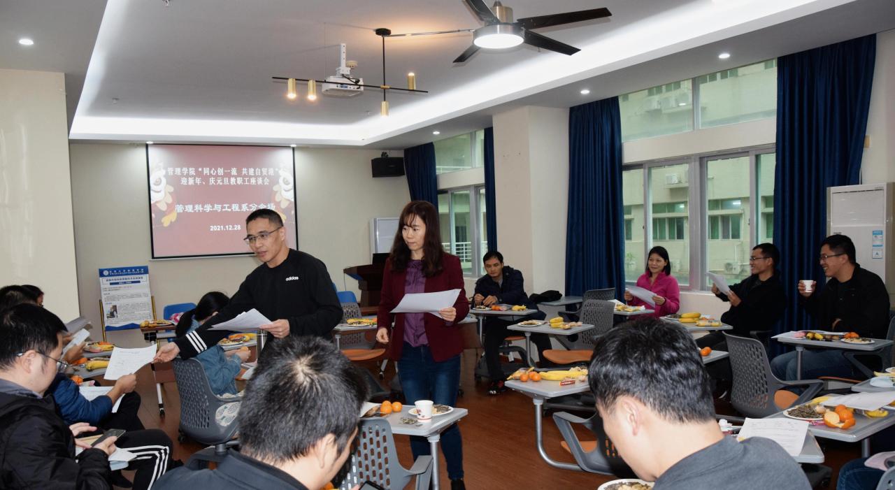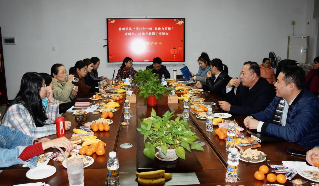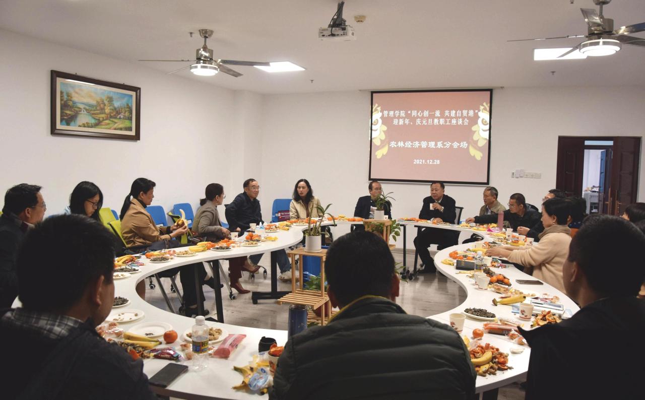 2021年12月28日下午,管理公司举行“同心创一流 共建自贸港”迎新年、庆元旦教职工座谈会。本次座谈会由公司工会组织承办,共分为五个分会场,包括工商管理系、会计系、农林经济管理系、管理科学与工程系以及综合管理分会场。全体教职工参加活动。