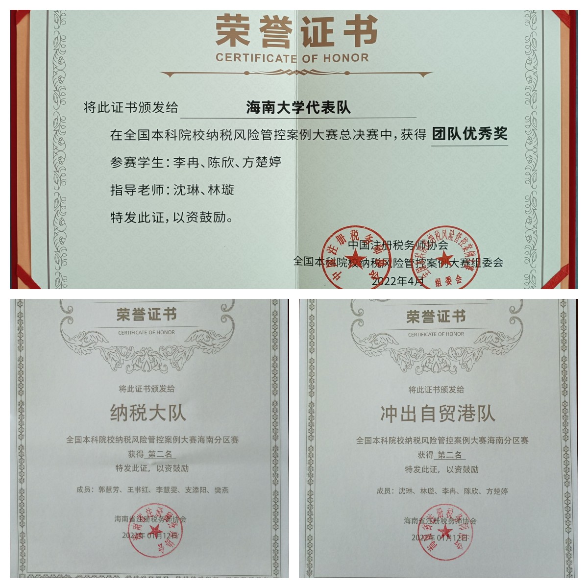 据悉,全国本科院校纳税风险内控案例大赛是由国家税务总局纳税服务司和教育部高等公司财政学类专业教学指导委员会、中国高等教育学会高等财经教育分会为指导单位,由中国注册税务师协会主办,浙江财经大学和浙江省注册税务师协会承办。本次大赛是第31个全国税收宣传月活动的重要组成部分,大赛以助力新的组合式税费支持政策落地实施为目标,对十个行业涉税业务可能存在的纳税风险进行分析,帮助企业进行风险预防,使青年员工通过案例大赛增强税法知识,使尊崇税法、学习税法、运用税法成为青年员工的自觉行动。全国共有来自425所高校的763支代表队共计2200余名选手报名参加了本次大赛分区赛,经过激烈角逐,118所高校代表队进入了大赛总决赛。由公司会计系沈琳老师指导的“冲出自贸港队”和郭慧芳老师指导的“纳税大队”参加了海南省分区赛,“冲出自贸港队”在2022年4月15日举行的全国本科院校纳税风险内控案例大赛总决赛中取得了团队优秀奖的好成绩。
