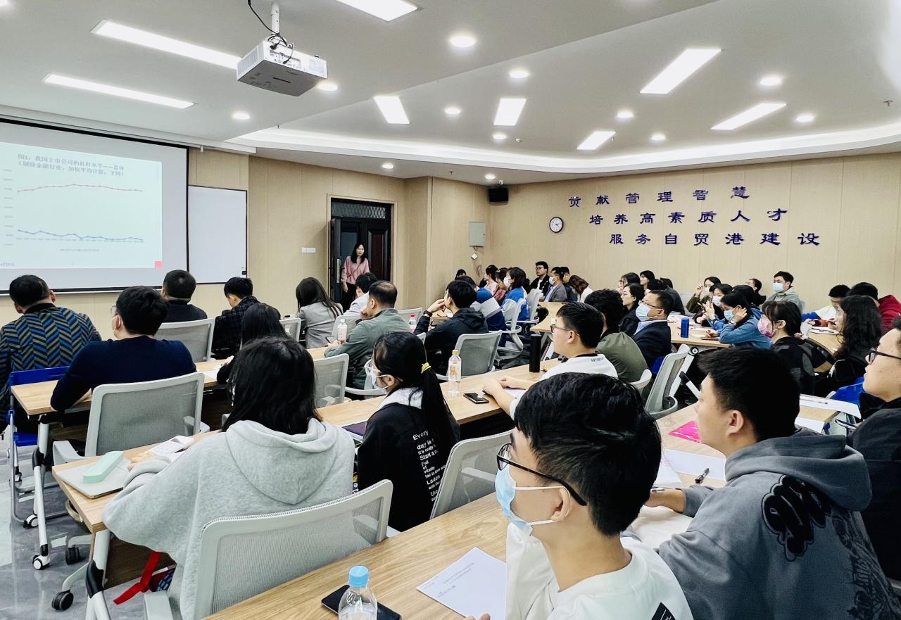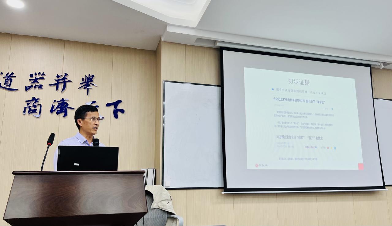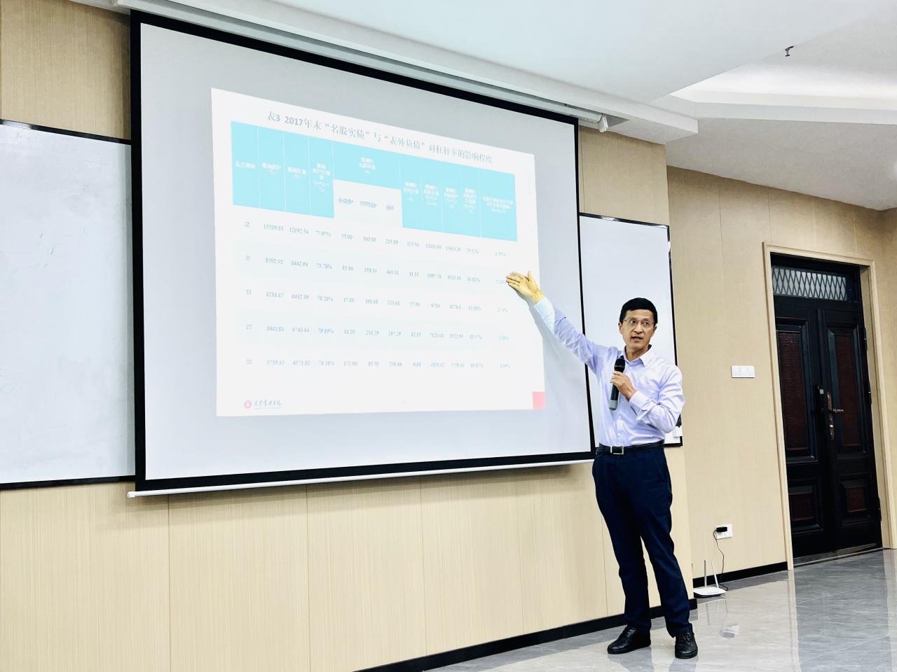 陆正飞教授分别从我国企业的过度负债问题、去杠杆与杠杆操纵、社会融资结构与过度投资三个方面进行了讨论。第一个方面,陆教授通过回顾2001—2020年间我国上市公司的总体杠杆水平,细致分析不同行业和产权性质下的杠杆水平,启发员工对“国有企业与非国有企业,谁更过度负债?”这一问题的深入思考,从长期动态和短期静态视角分析,揭露出政府隐性担保在国有企业降低过度负债风险的作用。第二个方面,从去杠杆的效果上看,我国政府的去杠杆政策基本达到了预期目标,但还存在央企、国企去杠杆程度不足,部分治理能力差的企业采用“非正常”方式去杠杆等问题。陆教授逐个分析了表外负债、名股实债与会计计量等3种常见的杠杆操纵手段,通过对企业杠杆操纵的会计后果分析,进一步说明抑制企业杠杆操纵的必要性。第三个方面,陆老师最新研究发现社会融资规模对企业过度投资程度产生显著影响,企业所在地区社融贷款比越高,则企业过度投资程度越大。他认为为了更好地支持实体经济发展,提高资金配置效率,必须大力发展直接融资,适当降低间接融资比例。