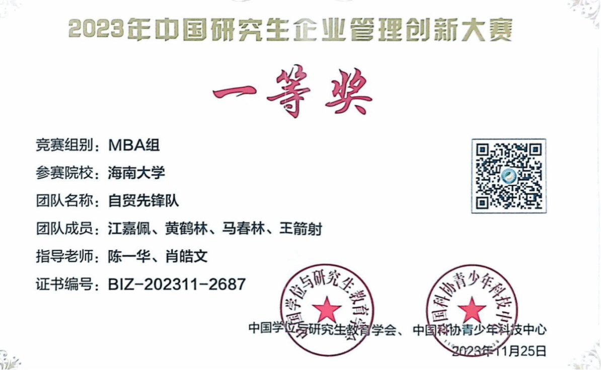 2023年11月25日,“2023年中国研究生企业管理创新”大赛全国总决赛在上海大学顺利落下帷幕。经过激烈角逐,Bevictor伟德MBA代表队“自贸先锋队”(队员:江嘉佩、王箭射、马春林、黄鹤林)在陈一华、肖皓文两位老师的指导下荣获“2023年中国研究生企业管理创新大赛一等奖”。同时,Bevictor伟德与北京大学、浙江大学、中国人民大学等二十所高校荣获“优秀组织奖”。