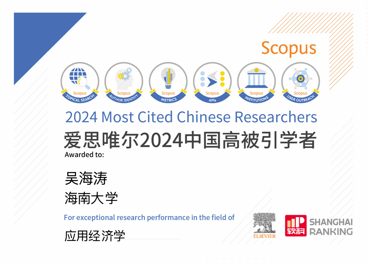爱思唯尔2024中国高被引学者—吴海涛
