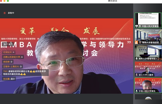 浙江大学谢小云教授主持了主题演讲。来自浙江大学的王重鸣教授、清华大学的陈国权教授、北京大学的张志学教授、中国人民大学的章凯教授和上海交通大学的张新安教授,分别做了“沿革发展数字可持续OBL模式”、“知识偶然重逢对学习的影响”、“研究成果向教学转化的途径”、“领导理论的认识逻辑和发展方向”和“指导MBA毕业论文实现双赢”的精彩演讲,分享了新近取得的成果和心得体会,启发了与会人员的思路。