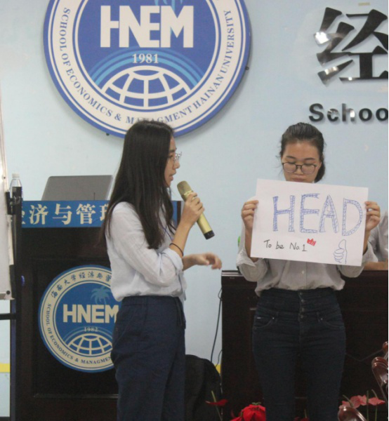 第一环节是分组和破冰。曲老师在工作人员的配合下,把参加活动同学分为9个小组,每个小组8位同学,每个小组先自行讨论商定本小组的队名和口号,把自己的队名和口号都写到纸板上,并依次上台展示。在展示环节,大部分的同学都是全英文展示介绍,展现了现各小组的精神面貌和团队精神。