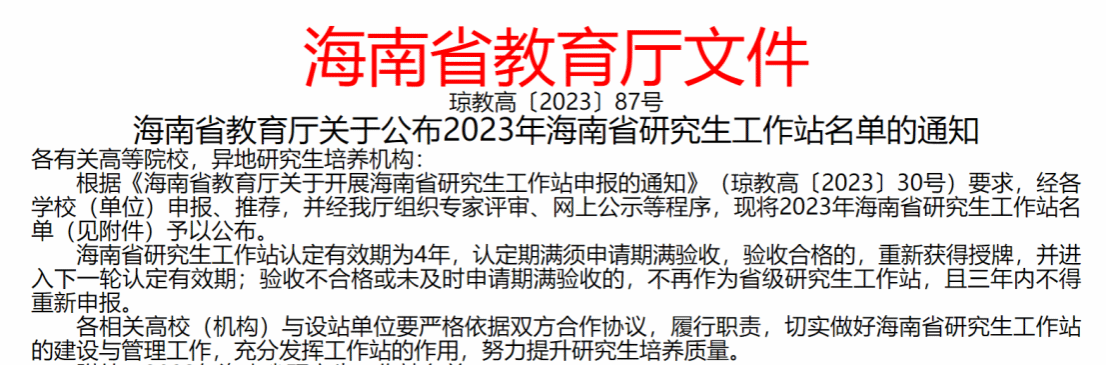 近日,海南省教育厅公布2023年海南省研究生工作站名单,共有40家单位入选。其中,由王丽娅教授牵头、伟德体育金融硕士学位点与海南省金融发展促进会联合申报并获批1个海南省首批研究生工作站。